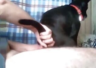 Black Doberman is being sucked